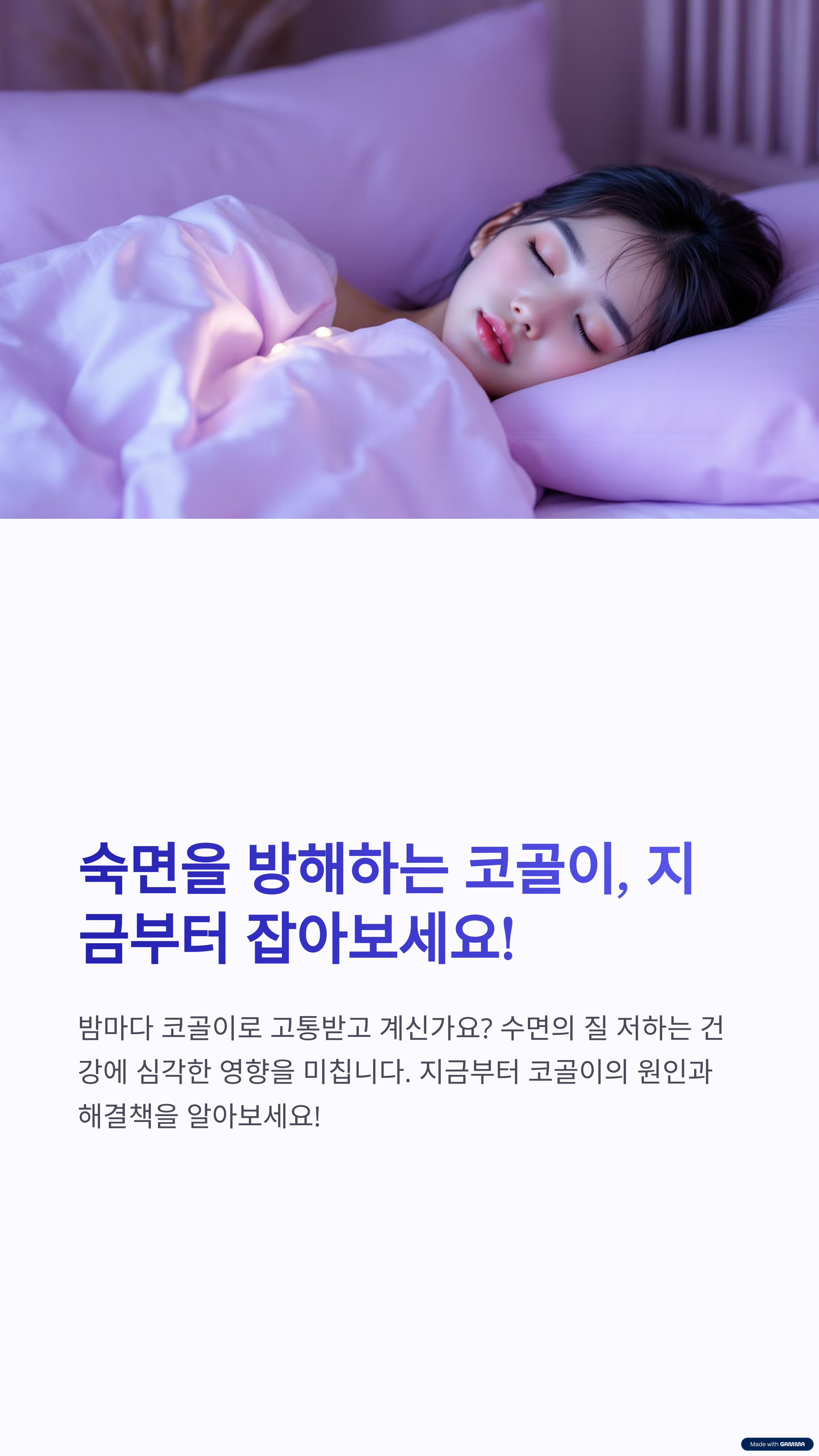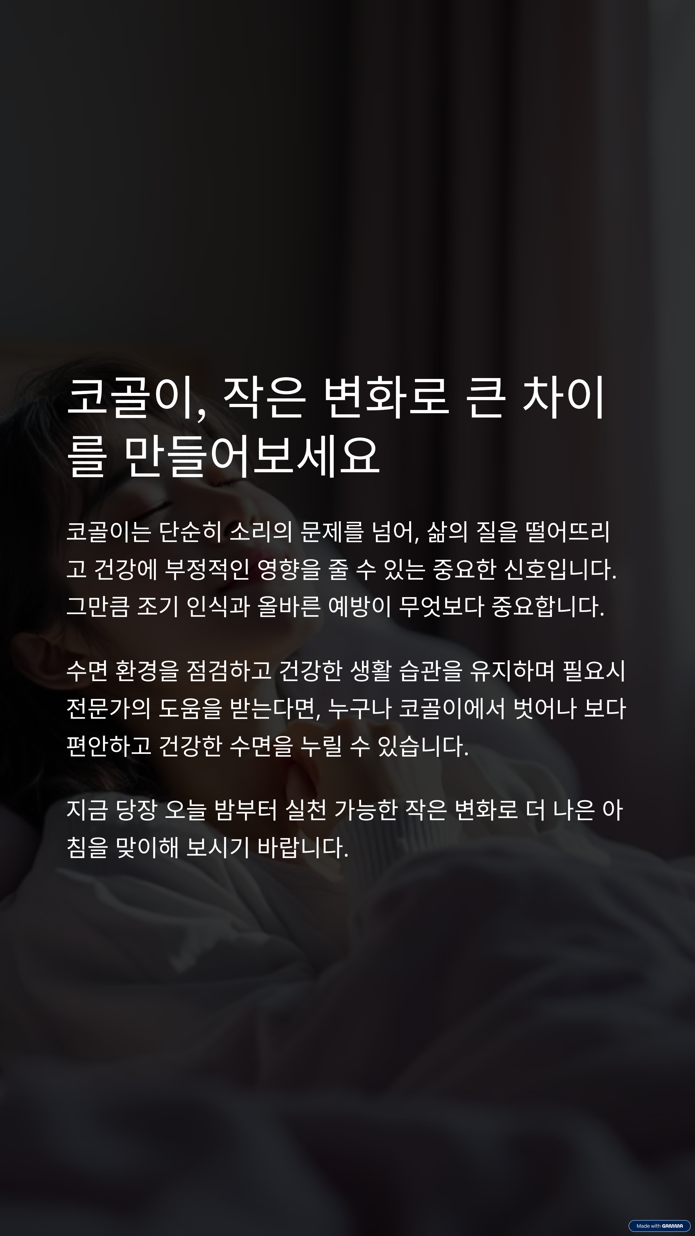 코골이는 단순히 소리의 문제를 넘어, 삶의 질을 떨어뜨리고 건강에 부정적인 영향을 줄 수 있는 중요한 신호입니다. 그만큼 조기 인식과 올바른 예방이 무엇보다 중요합니다. 수면 환경을 점검하고 건강한 생활 습관을 유지하며 필요시 전문가의 도움을 받는다면, 누구나 코골이에서 벗어나 보다 편안하고 건강한 수면을 누릴 수 있습니다. 지금 당장 오늘 밤부터 실천 가능한 작은 변화로 더 나은 아침을 맞이해 보시기 바랍니다.