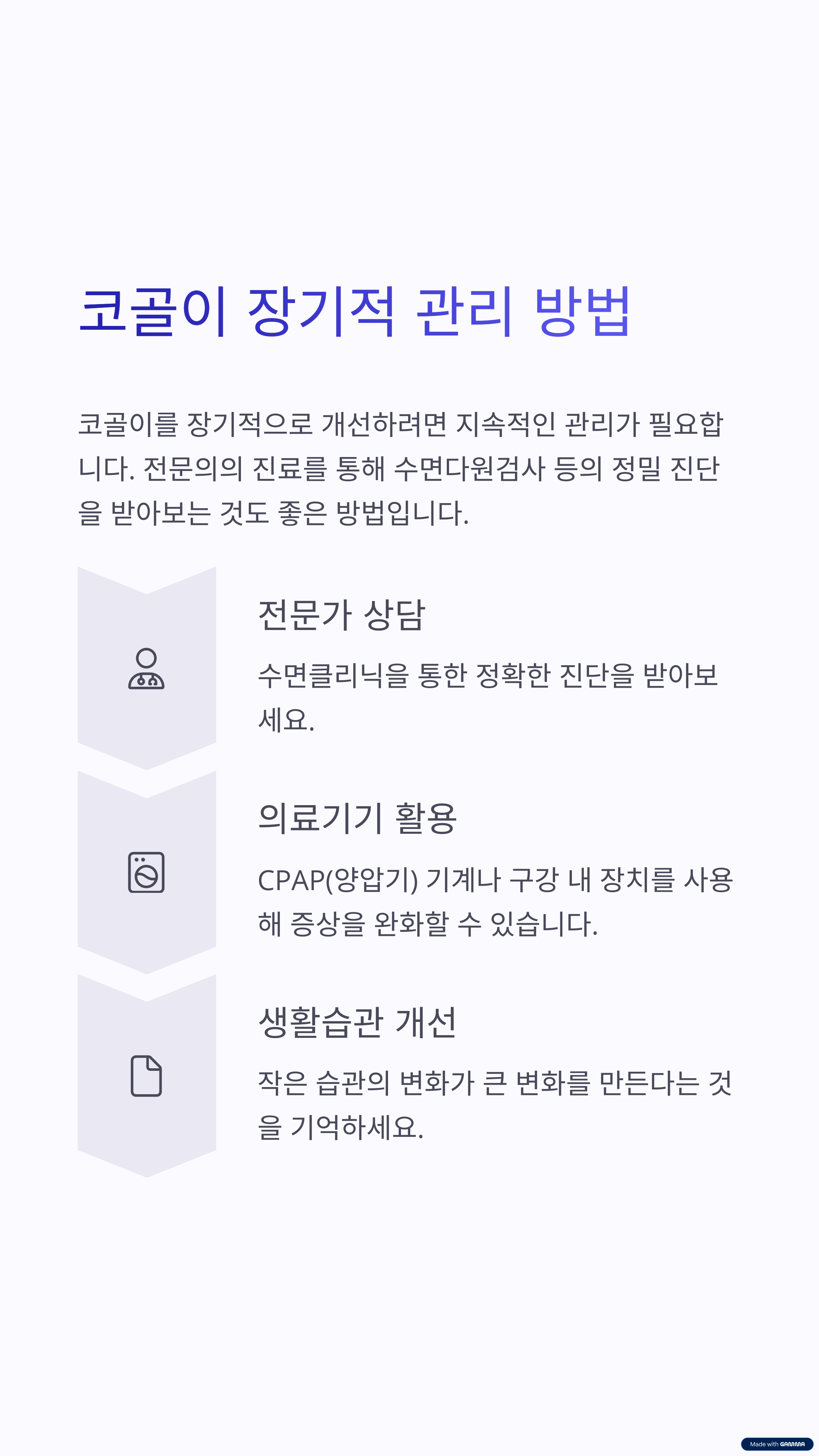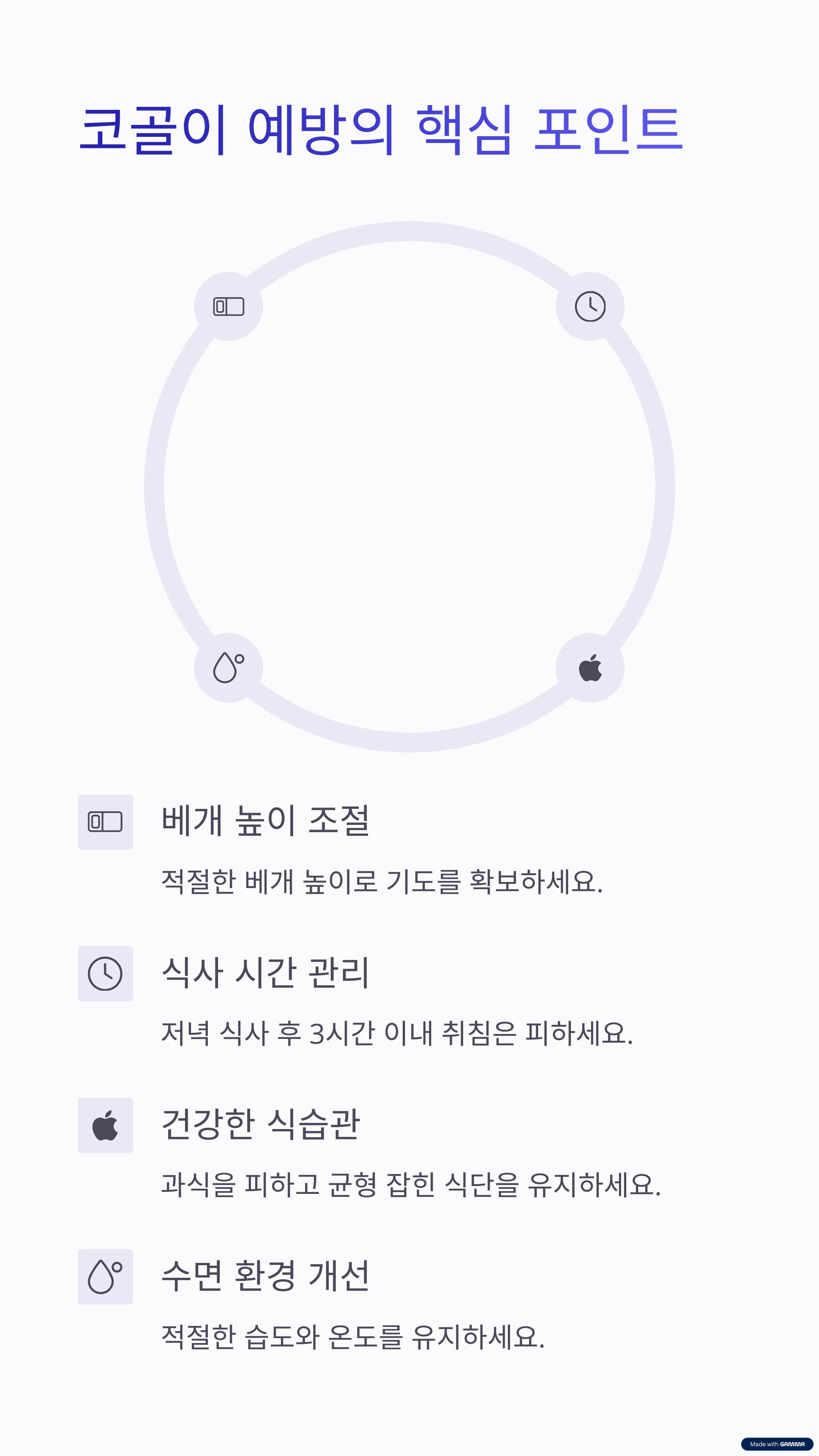 | 베개 높이도 중요한 요소 중 하나입니다. | 저녁 식사 후 3시간 이내 취침은 피하세요. | 양압기 등 기기 사용도 도움이 될 수 있습니다. |