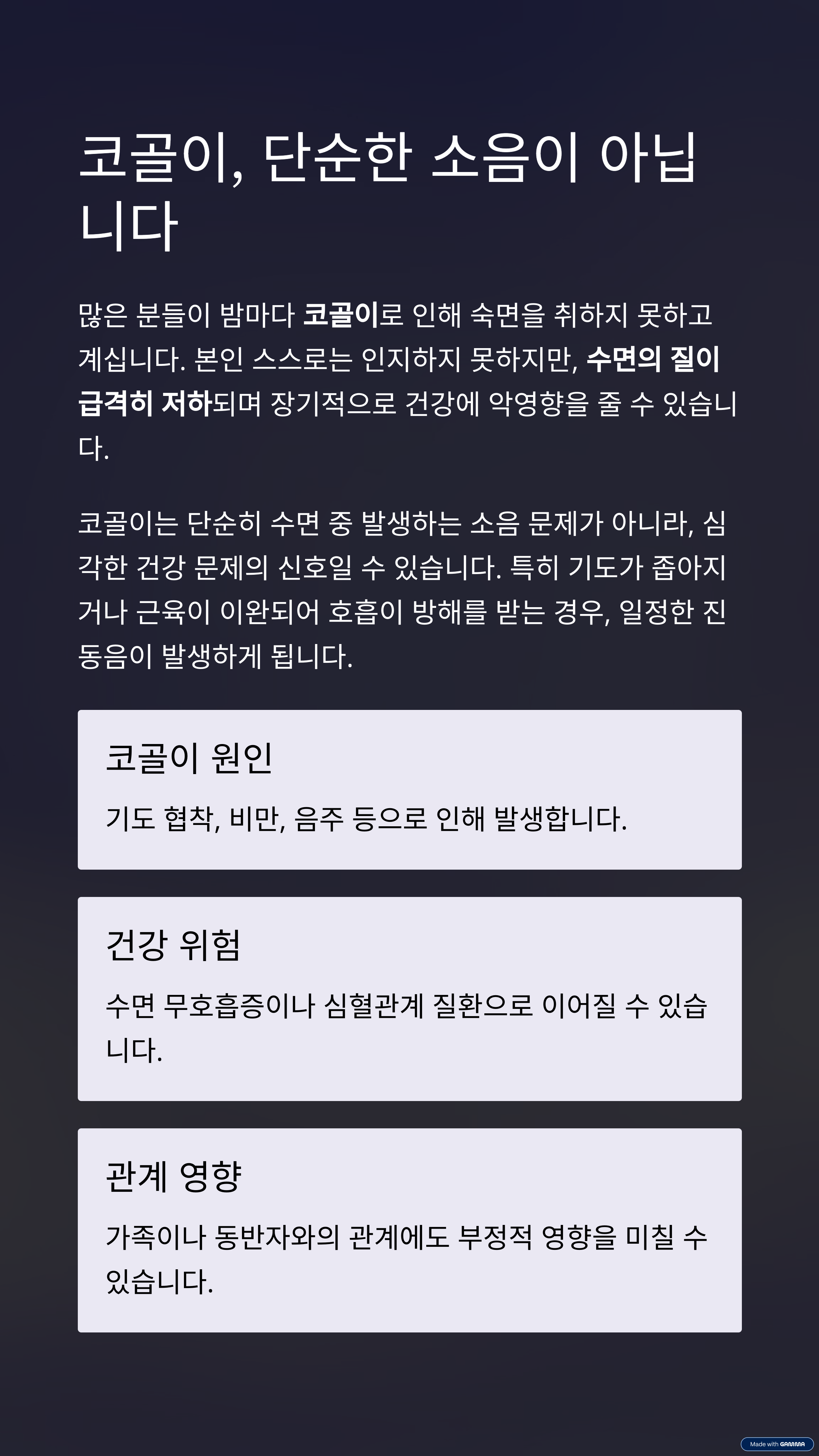 | 코골이 원인 | 기도 협착, 비만, 음주 등으로 인해 발생합니다. |
