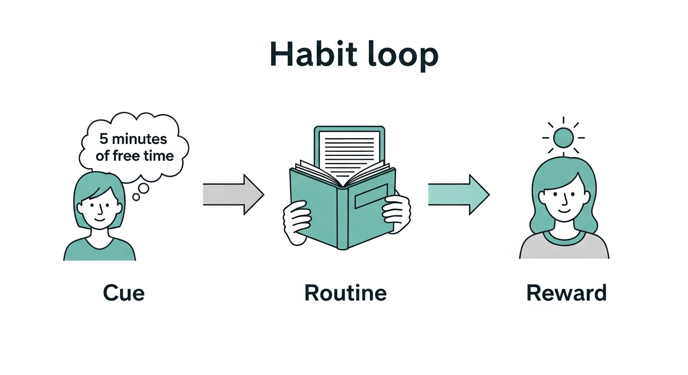 특정 행동을 반복하면 '습관의 고리(Cue-Routine-Reward)'가 형성됩니다. 예를 들어, "점심시간 후 커피를 마신다(Cue) → 5분간 책을 읽는다(Routine) → 지적 만족감을 느낀다(Reward)"와 같이요. 이러한 반복은 독서를 자연스러운 일상의 일부로 만들어줍니다.
