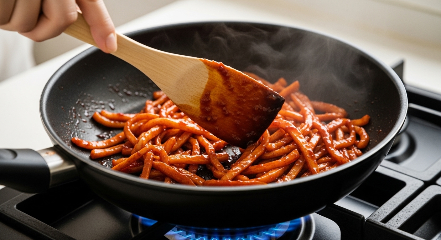 - 팬 예열 및 양념장 끓이기: 약불로 팬을 예열한 후 식용유를 아주 약간만 두르고, 미리 만들어둔 양념장을 팬에 넣어 살짝 끓여주세요. 양념장이 보글보글 끓어오르면서 특유의 향이 올라오면 딱 좋아요. 이때 절대 양념을 태우지 않도록 주의해야 합니다.