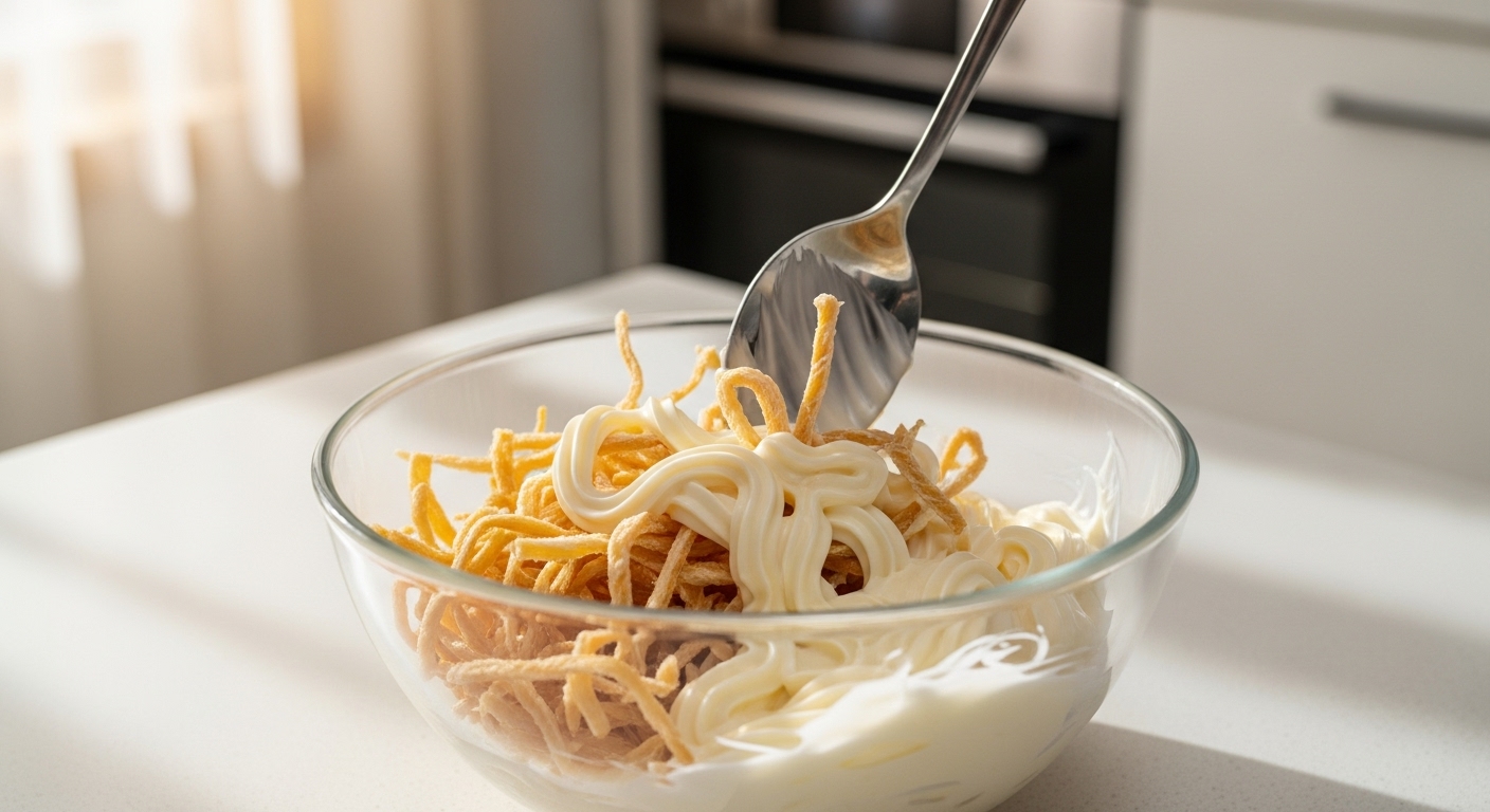비린 맛에 민감하시다면 우유에 담그는 방법을 추천해요. 진미채를 우유에 5분 정도 담갔다가 물로 가볍게 헹궈 물기를 제거하면 비린 맛도 잡고 더욱 부드러운 식감을 얻을 수 있답니다. - 마요네즈에 버무리기 (가장 강력 추천!)