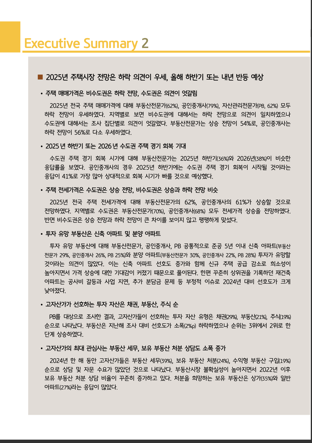 보고서는 2025년 주택시장을 분석하며, 전반적으로 시장이 하향 안정세를 보일 것으로 전망했습니다. 최근 몇 년간 주택가격은 상승과 하락을 반복하며 혼란스러운 흐름을 보였습니다. 특히 2024년 하반기 수도권 중심으로 일시적 회복을 보였으나, 여전히 고금리 환경, 정부의 강력한 대출 규제 정책 등으로 시장 상승은 제한적일 전망입니다.