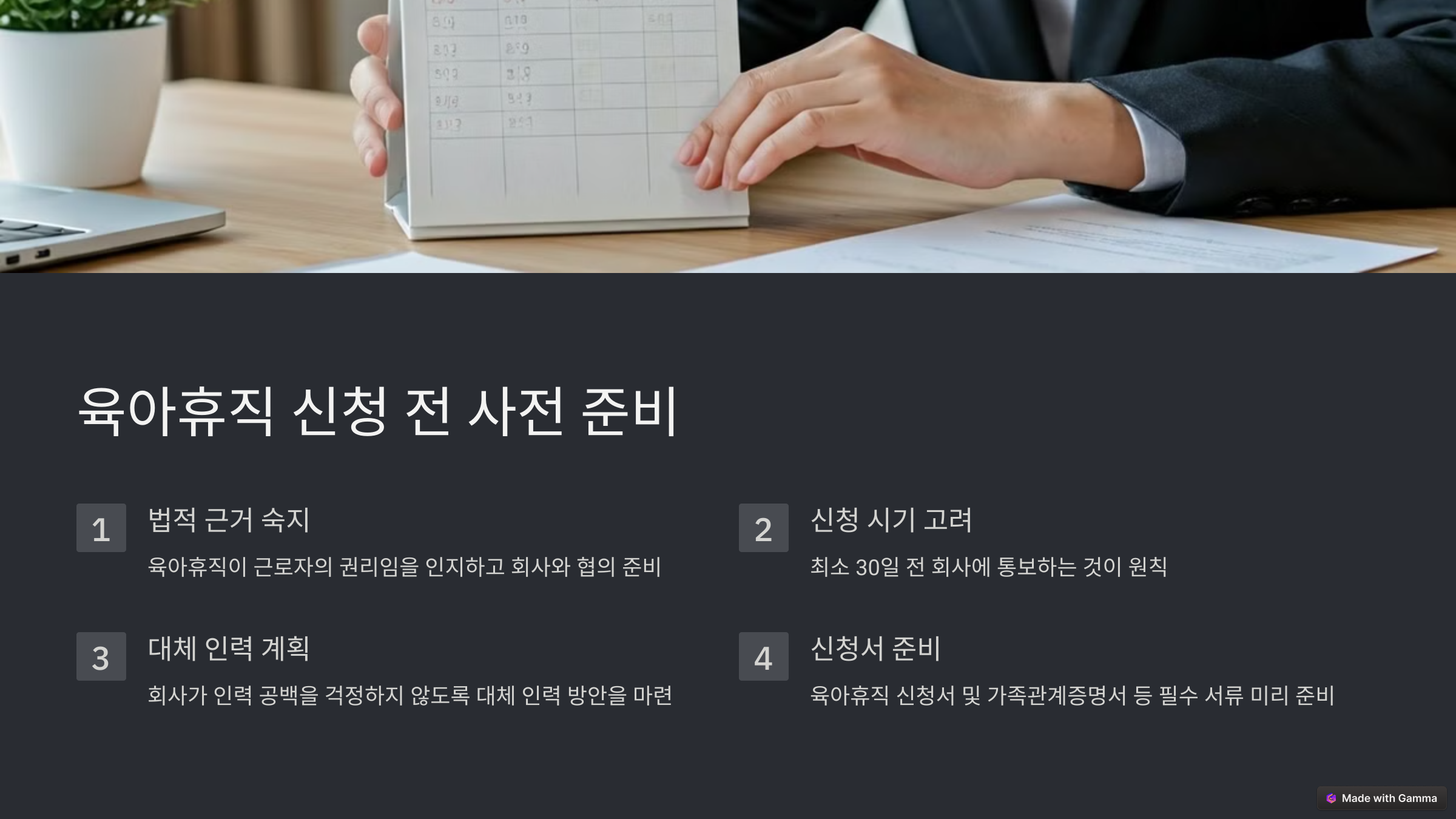 - 📝 문서화된 계획 제출: 휴직 후 복귀 일정 및 업무 인수인계 계획을 포함한 공식 문서 작성
