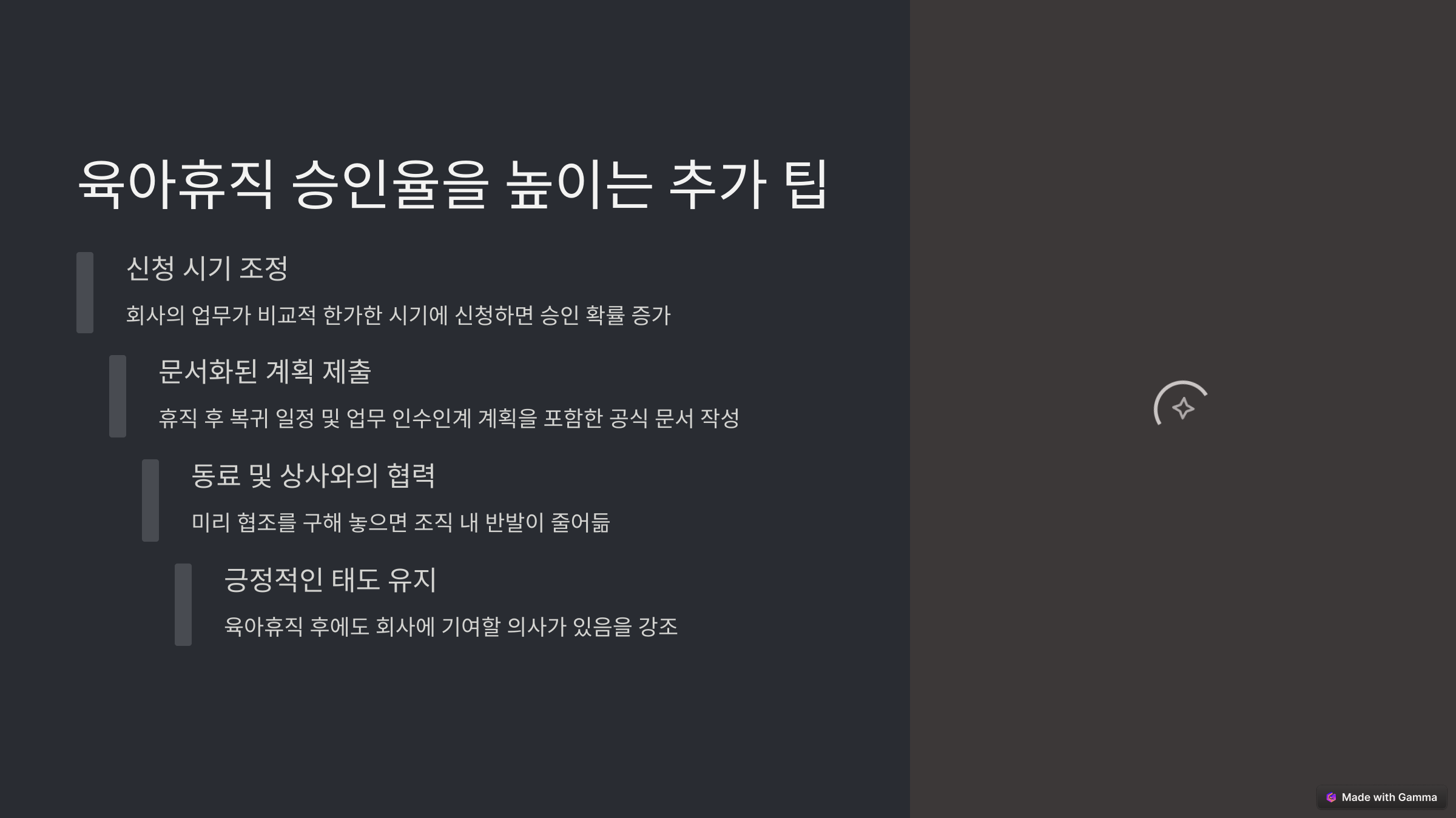 - 💬 긍정적인 태도 유지: 육아휴직 후에도 회사에 기여할 의사가 있음을 강조