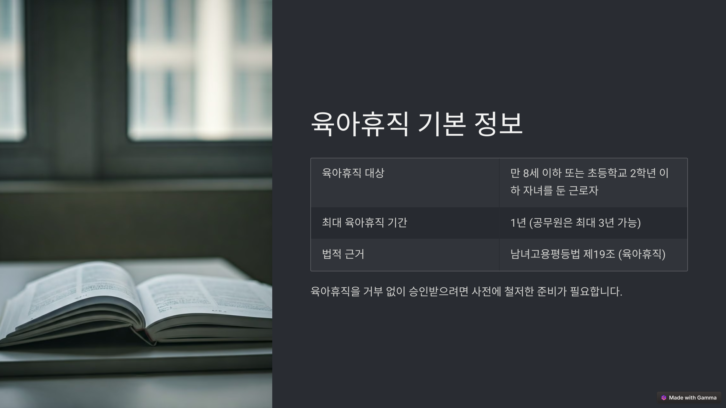 - 📢 내부 인사 규정 확인: 회사 내부 정책에서 육아휴직을 명시한 조항이 있는지 검토